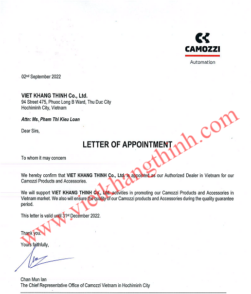 Kể từ 2022 Việt Khang Thịnh trở thành đại diện phân phối các sản phẩm Camozzi Italy tại thị trường Việt Nam